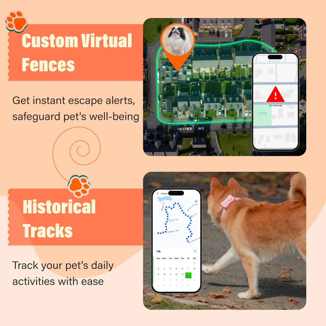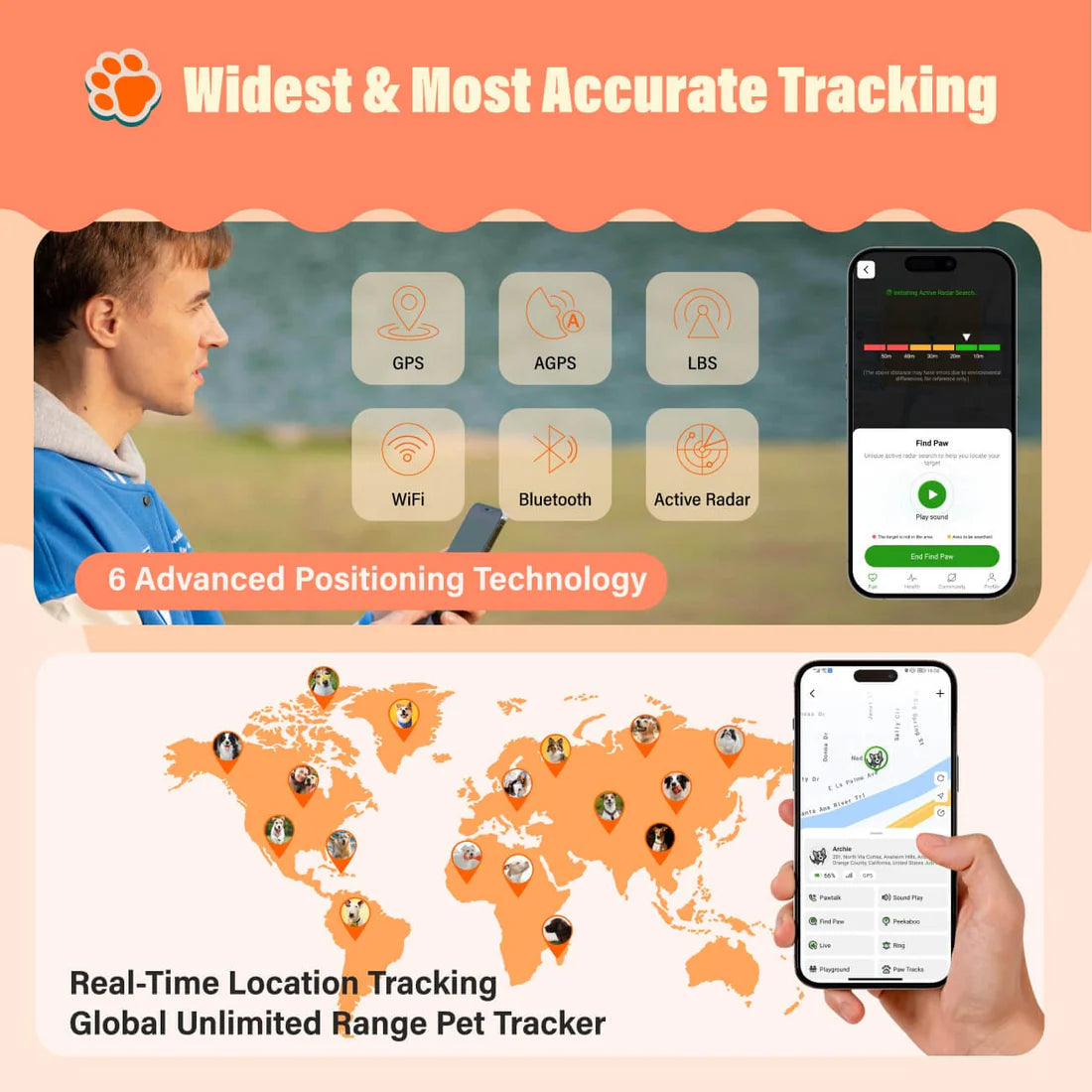 - The World’s Widest & Most Accurate Tracking: PetPhone tracker is equipped with 6 advanced location technologies, including GPS, AGPS, LBS, Bluetooth, WiFi, and Active Radar, providing unlimited range real-time tracking. In real-time mode, locate your pet accurately anywhere. Use the active radar to find your pet within a hundred meters, and within fifty meters, use light and ringing modes for more precise tracking. Set up a virtual fence, and receive immediate alerts if your pet leaves the safe zone, ensuring their safety.