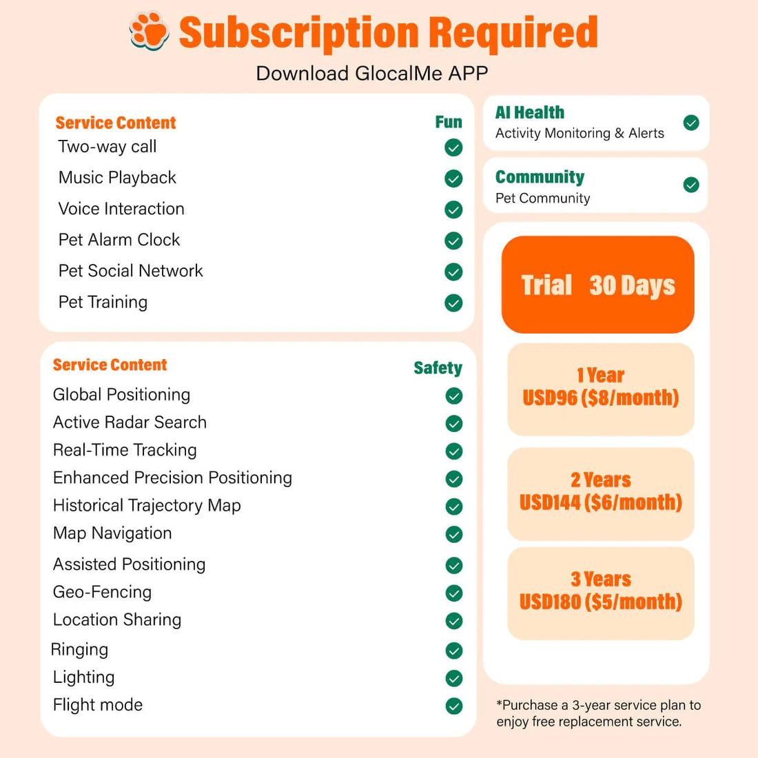 - Subscription Plan Needed: This PetPhone pet tracker comes with a one-month trial service and must be used in conjunction with the GlocalMe APP. Subscription plans are available for 1 year, 2 years, or 3 years, with the 3-year plan averaging only $5 per month. PetPhone is compatible with both Apple iOS and Android devices. If you encounter any problems, we offer 24/7 online live customer support.
